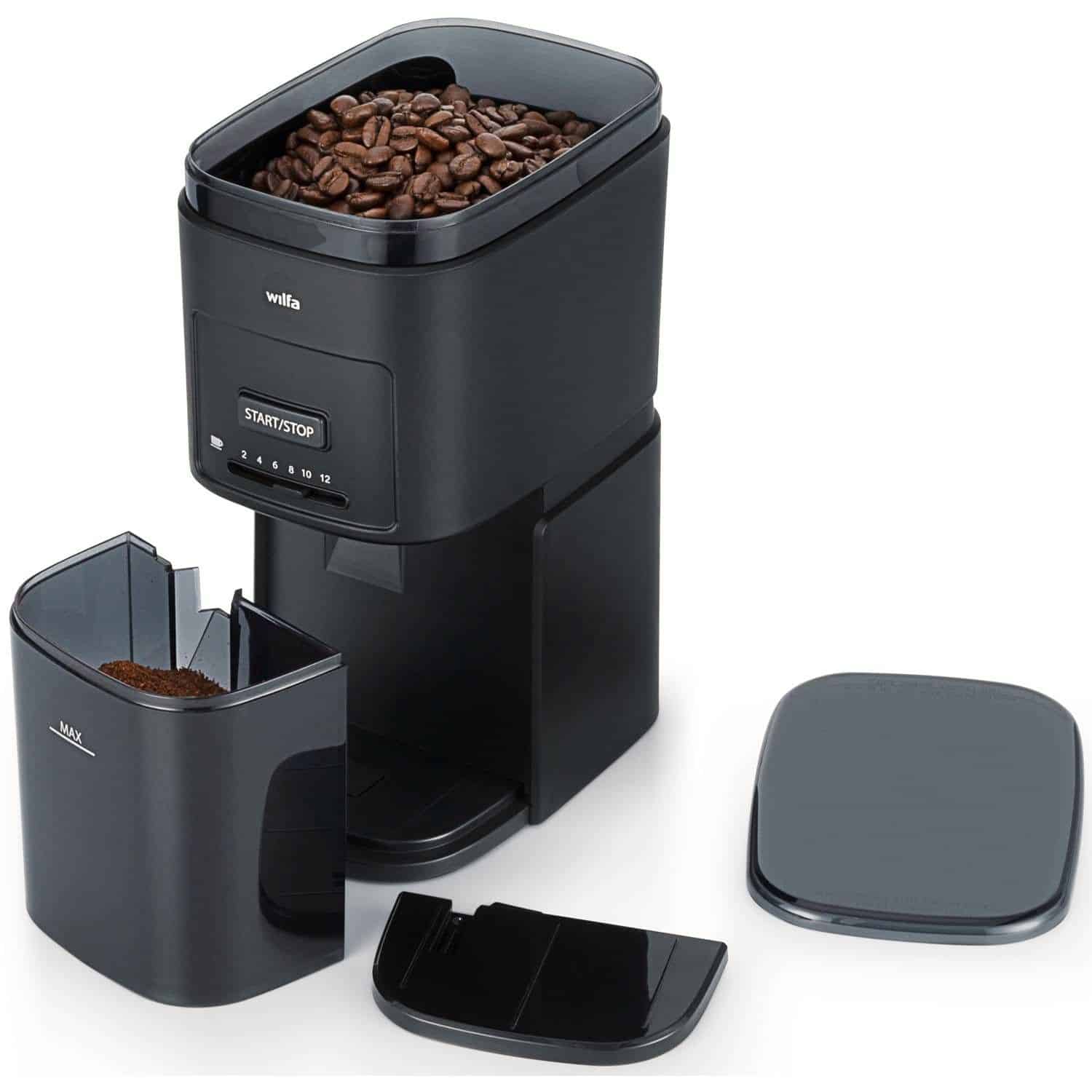 Kværnen har en automatisk stopfunktion, hvilket betyder, at den slukker af sig selv, når den valgte mængde kaffebønner er malet.